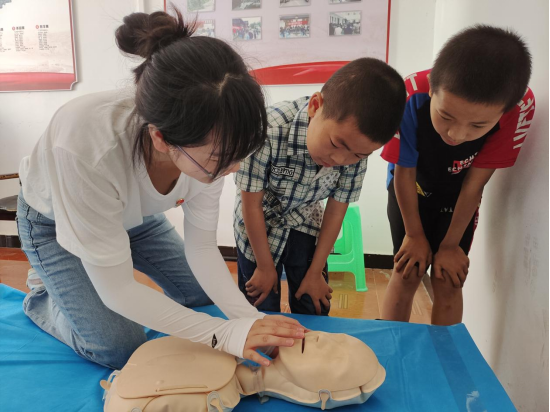 “青”情守护,呵护健康。队员们给当地留守儿童现场演示急救知识心肺复苏和海姆立克急救法,帮助小朋友们掌握一定的自救常识,并耐心地向孩子们讲解心理健康教育知识,陪他们一起玩游戏,帮助孩子们在游戏的世界里打开心扉,感受成长的快乐。留守儿童们都收到了老师们精心准备的学习用品,脸上洋溢着灿烂的笑容。