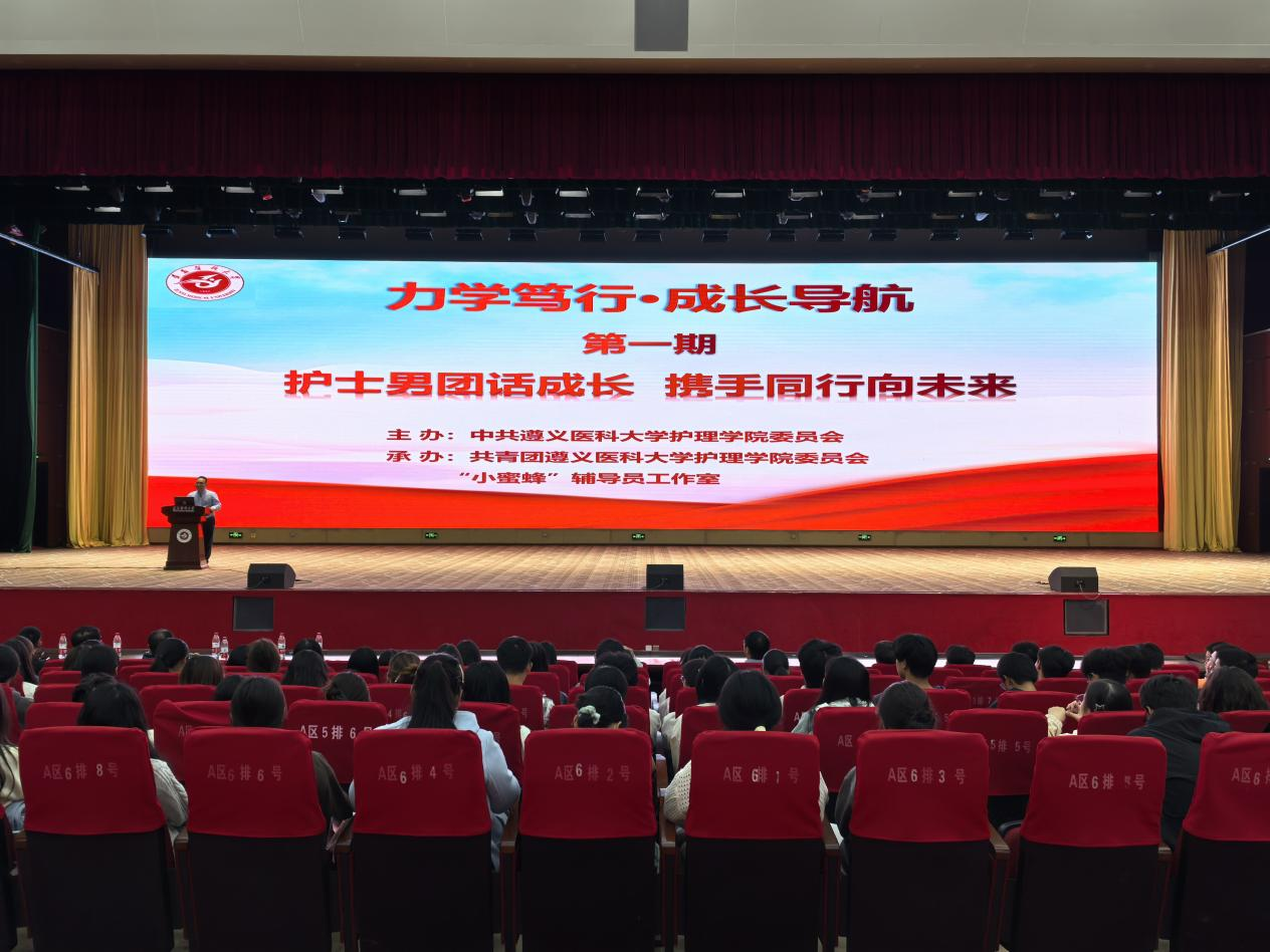 为持续抓好学生思想政治教育和新生入学教育工作,2024年10月22日18:30,遵义医科大学护理学院在学校会堂开展了以“力学笃行·成长导航——护士男团话成长 携手同行向未来”为主题的成长导航活动。护理学院党委副书记陈伟、年级辅导员及学院2024级新生以及在校年级共900余名学生参加活动。