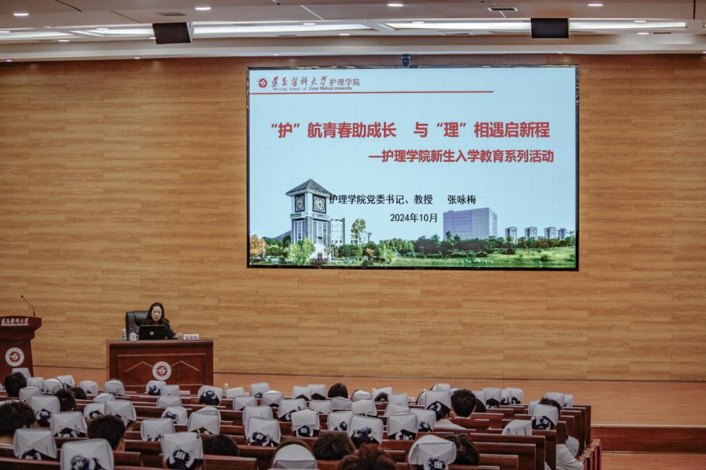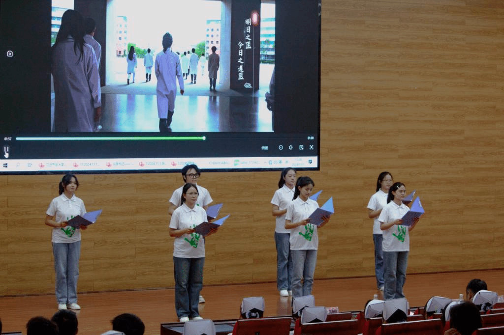 树立远大理想,争做时代新人。大会在庄严的国歌声中拉开序幕。2024级新生代表张元佳上台发言,号召同学们当勇立潮头,在新时代新征程上,迸发青春生机,生发青春力量,坚定不移听党话、跟党走,用青春书写时代赋予的责任与担当。随后,邓静怡、李晓宇等七名新生代表朗诵诗歌——《托起生命的航船》,表达出了对遵医无限的热爱与赞美以及对医学伟大事业的向往与憧憬。