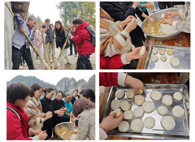 老少携手打糍粑,共同劳动树风尚。打糍粑是农村一项传统的劳动民俗活动,通过打糍粑,体现团结的意义,表达村民对亲朋好友的祝福和对美好生活的期盼。在村民罗登亮家中,师生和村民们围在一起,将煮熟的糯米倒入石槽中,人手一根木棍,在槽里不断搅动、舂打。一段时间后,师生们开始搓团,将糍粑裹上白糖和黄豆粉,香甜软糯的糍粑便新鲜出炉。师生与村民们一同尽享劳动的果实,洋溢着欢快、温馨的笑容。