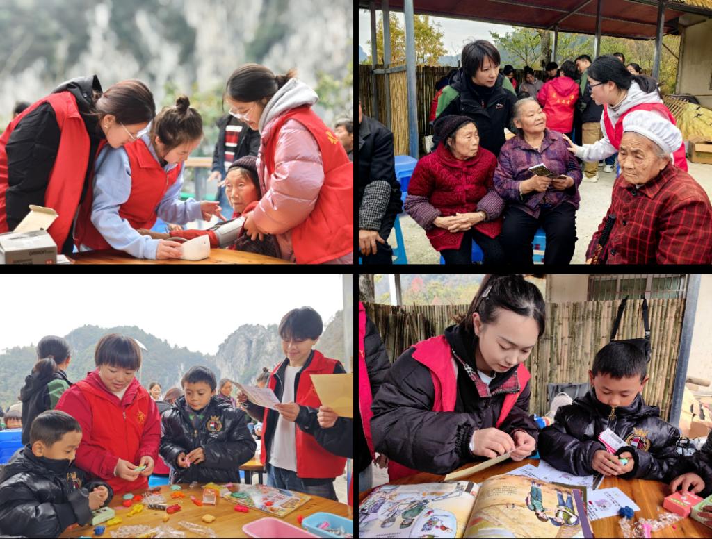 健康知识进乡村,共筑乡村健康梦。师生一行走进村民罗登亮家中,为等候在这里的村民测血压,向村民宣讲秋冬季常见疾病类型、预防措施以及冬季养生保健等健康知识,并教授他们做“八段锦”,帮助村民提升健康意识。向儿童们赠送健康科普绘本等书籍,教他们了解自己的身体以及如何科学认识病毒,引导儿童们树立正确的健康观念。活动现场,师生们还组织老人、儿童一同参与“套套圈”“拧扁担”“围圈跳舞”等趣味活动,丰富了老人、儿童们的精神文化生活,增强了他们的获得感与幸福感。