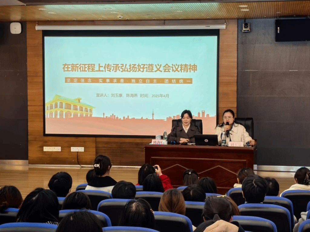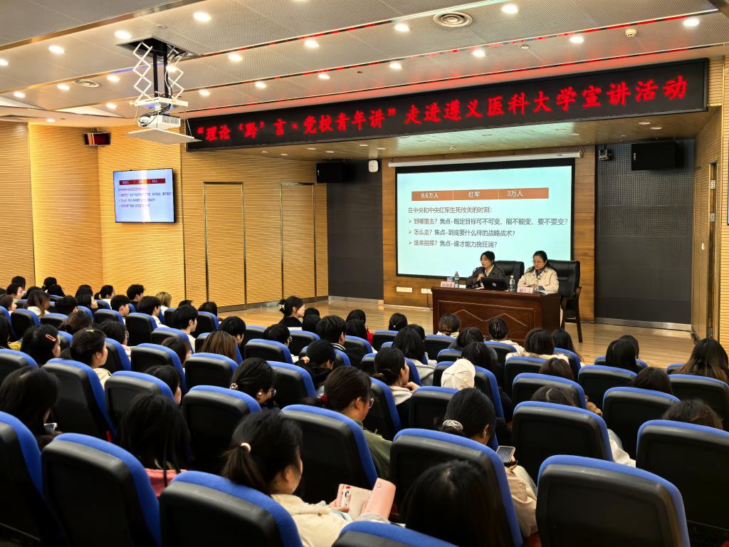 2025年4月1日下午,“理论‘黔’言·党校青年讲”宣讲活动走进遵义医科大学护理学院。本次宣讲活动采用“理论宣传二人讲”模式,由中共贵州省委党校马克思主义学院陈海燕和刘玉康两位讲师以“在新征程上传承弘扬好遵义会议精神”为主题展开宣讲。护理学院150余名师生代表参加宣讲活动。