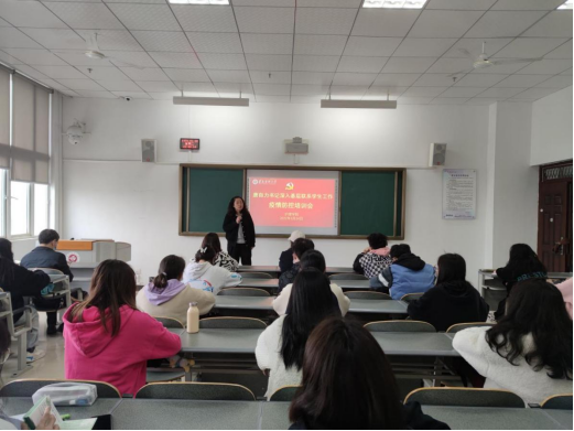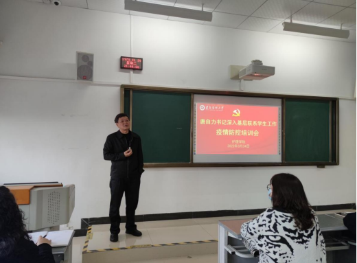 2022年3月24日上午10:30,遵义医科大学党委委员、遵义医科大学附属医院党委书记唐自力在新蒲校区第一教学楼4-20B教室,给护理学院护理学专业2020级1班全体学生开展疫情防控培训。护理学院党委书记张咏梅、辅导员谢长泉、吴雪双以及教师兼职班主任尚志会参加了此次培训会。
