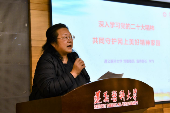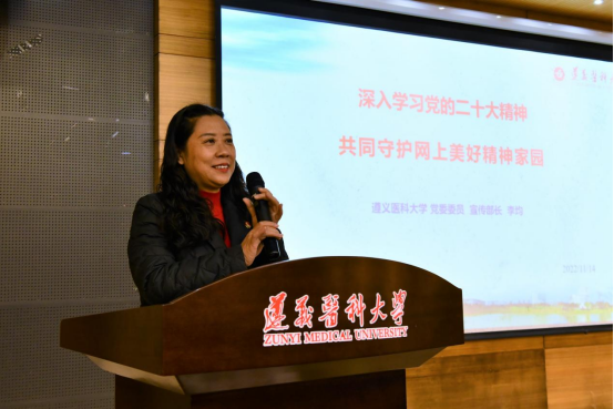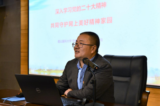 李均部长以《深入学习党的二十大精神共同守护网上美好精神家园》为主题,向大家讲述了党的二十大召开的重大意义,分析了党的二十大报告的核心要义,并结合我校发展实际,介绍了近几年我校取得的成就,勉励同学们深入学习贯彻党的二十大精神,在学习和工作中齐心助力高质量发展,为全面建成社会主义现代化强国、实现第二个百年奋斗目标贡献自己的青春力量。随后,李均部长向大家讲解了网络安全相关方面的法律法规,希望同学们增强网络安全意识,养成文明健康的网络生活方式,培育崇德向善的网络行为规范,做合格网民,共同守护网上美好家园。