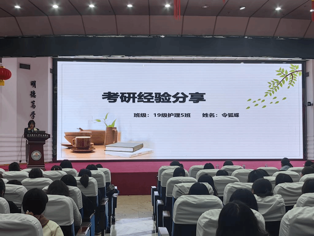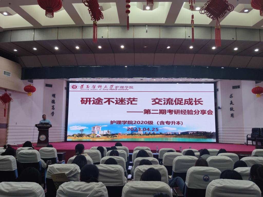 为加强学院学风建设,引导和帮助同学们树立考研目标,科学掌握备考方法,及时做好学业规划。2023年4月25日20:00,护理学院在遵义医科大学附属医院第二住院部四楼多功能厅举办了“研途不迷茫,交流促成长”考研经验分享会。护理学院党委书记张咏梅、党委副书记陈伟、2020级专、兼职辅导员及2020级(含专升本)全体学生参加了此次活动。