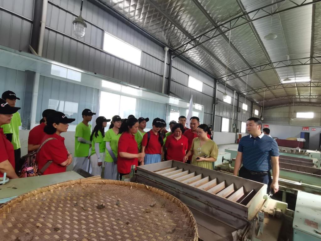 走进茶园,在茶农的指导和示范下,师生们认真领会采摘技巧和要领,随即变身“茶农”投入到采摘的劳动中。同学们手挎竹篮在茶园里穿梭忙碌,一片片嫩绿的茶叶迅速装满了竹篮。采茶现场,学生们化身“销售员”,同杜富佳书记一起走进直播间,助力现场直播带货,生动活波的直播方式吸引了大量网友观看,并成功将线上流量转换为了线下的销售量。在杜富佳书记的陪同下,师生们参观了当地的茶厂,茶厂负责人从制茶流程、制茶工艺、经营情况等方面给大家作了详细讲解,让大家对茶产业有了更深入的了解。同时,学院党委书记张咏梅,党委副书记、院长邓仁丽结合学科,就大学生创新创业课题拓展与企业负责人进行交流。