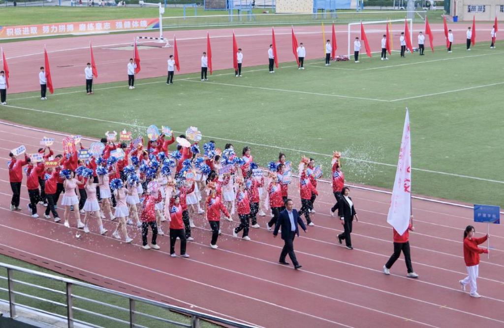 学院运动员方队迈着铿锵有力的节奏行进,整齐的队列是他们的态度;花环队手捧色彩斑斓的花环,洋溢着青春的活力;啦啦队的白裙随鼓点肆意飞扬,彩色泡泡晕染出青春的绚烂底色,在田径场上铺就成一条绮丽的星河,护理学子的严谨与运动的活力被揉成了最鲜活的青春模样!